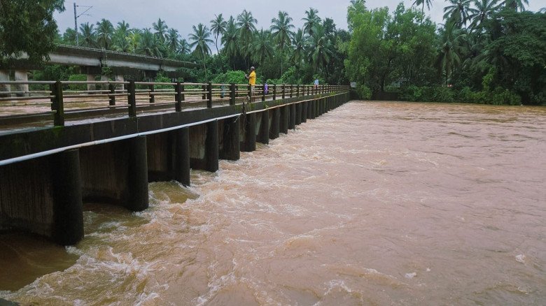 ಭಾರಿ ಮಳೆಗೆ ವಾಹನ ಸಂಚಾರ ಅಸ್ತವ್ಯಸ್ತ; ಮೈದುಂಬಿ ಉಕ್ಕಿ ಹರಿಯುತ್ತಿರುವ ನಮ್ಮೂರಿನ ನಂದಿನಿ ನದಿ